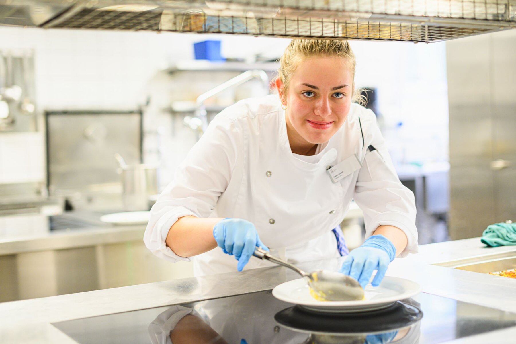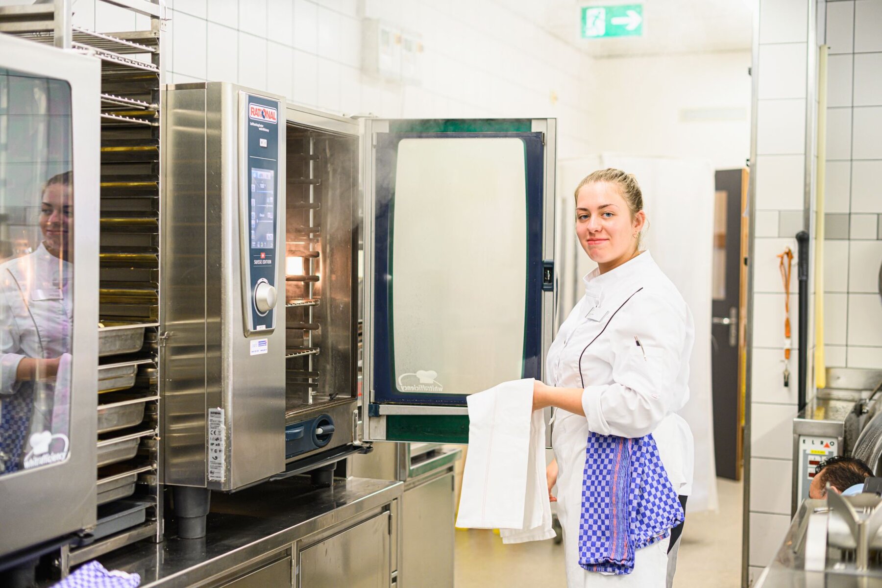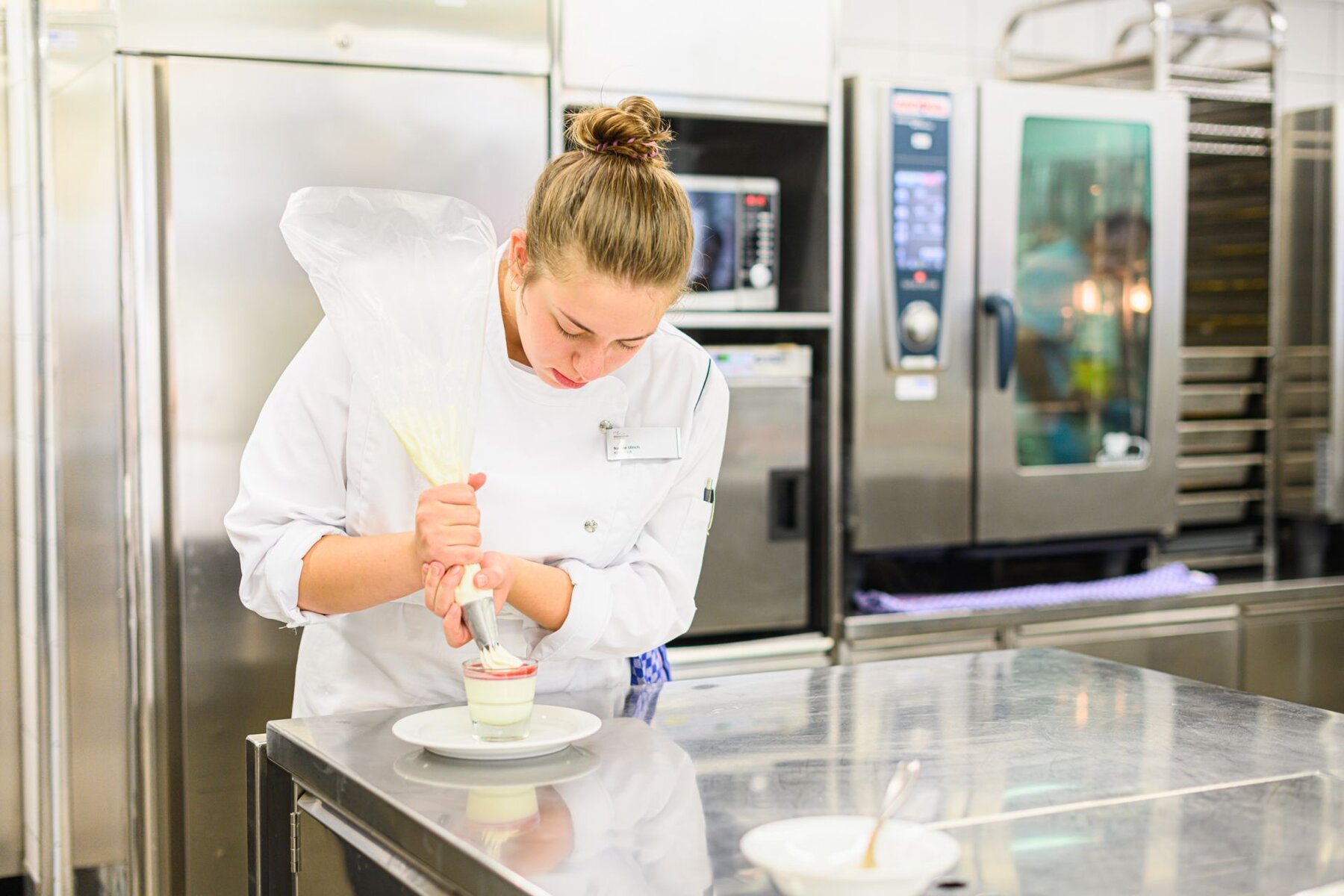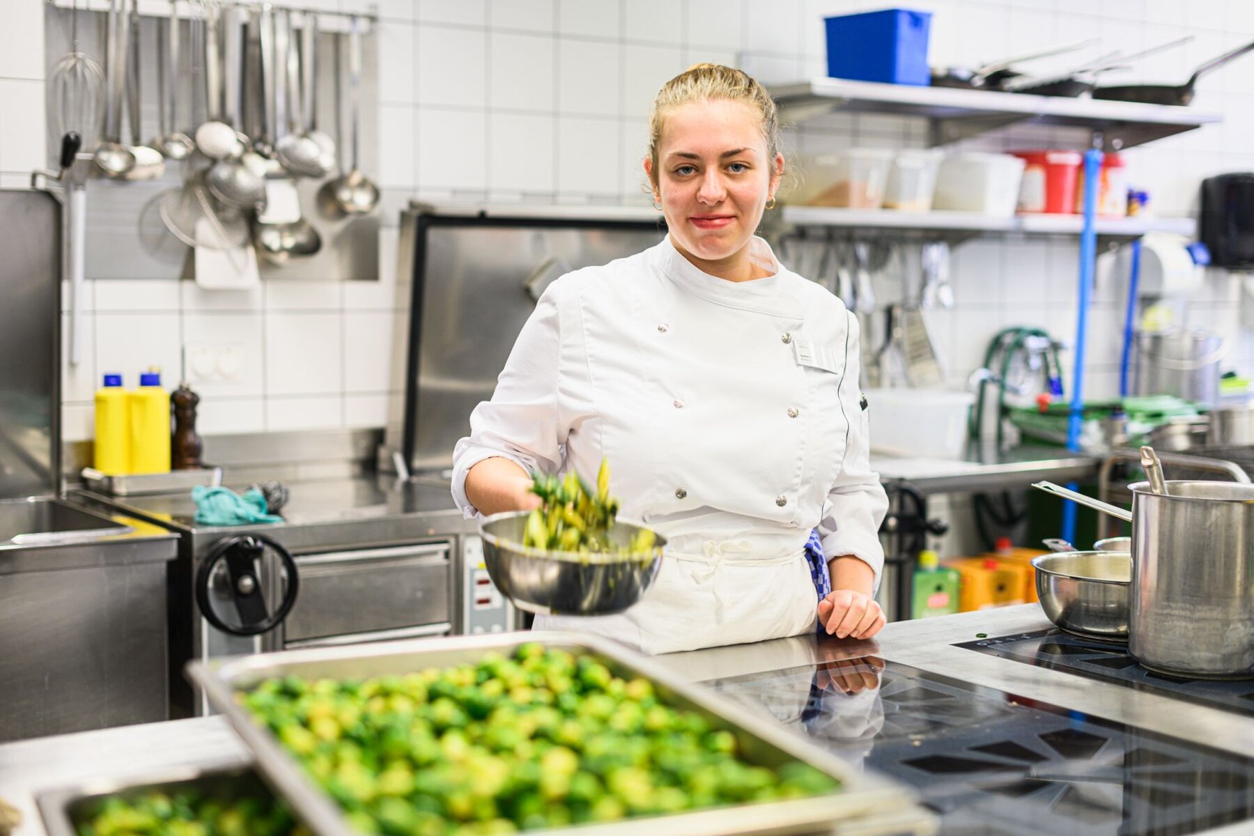 Nadine Ulrich hat sich aus mehreren Berufen jenen ausgesucht, bei dem kreatives Arbeiten, ein abwechslungsreicher Alltag, tägliches Dazulernen, Teamarbeit und ein sichtbares Resultat gegeben sind. Nach einen Schnupperlehre stand der Beruf als Köchin EFZ für sie fest, und nun steht sie also tagsüber (ein Vorteil von Pflegeinstitutionen gegenüber der Gastronomie) in der Küche unseres Zentrums vom Frühstück über das Mittagessen inkl. Salatbuffet und Mahlzeitendienst bis hin zum Nachtessen im Einsatz, sei es in der Frühschicht von 7.30–16.40 oder in jener von 9.45–18.45 Uhr. Es macht ihr Spass, die Wünsche der Gäste auf schmackhafte Art zu erfüllen. Die Sorgfalt gehört dabei zu ihren obersten Pflichten, weil schnell etwas passieren kann. Nach der Lehre könnte sie sich eine Weiterbildung zur Diätköchin, ev. bis zum Traumberuf der Ernährungsberaterin vorstellen.